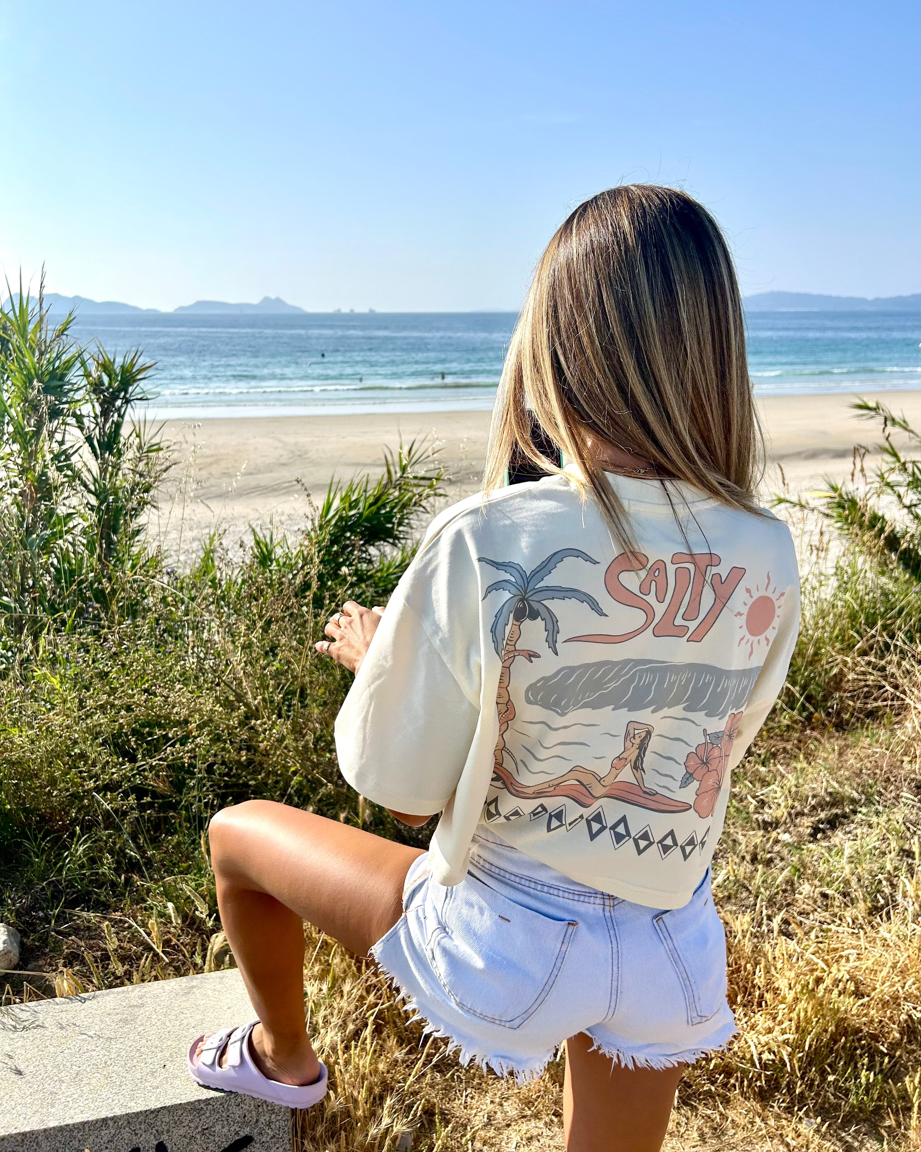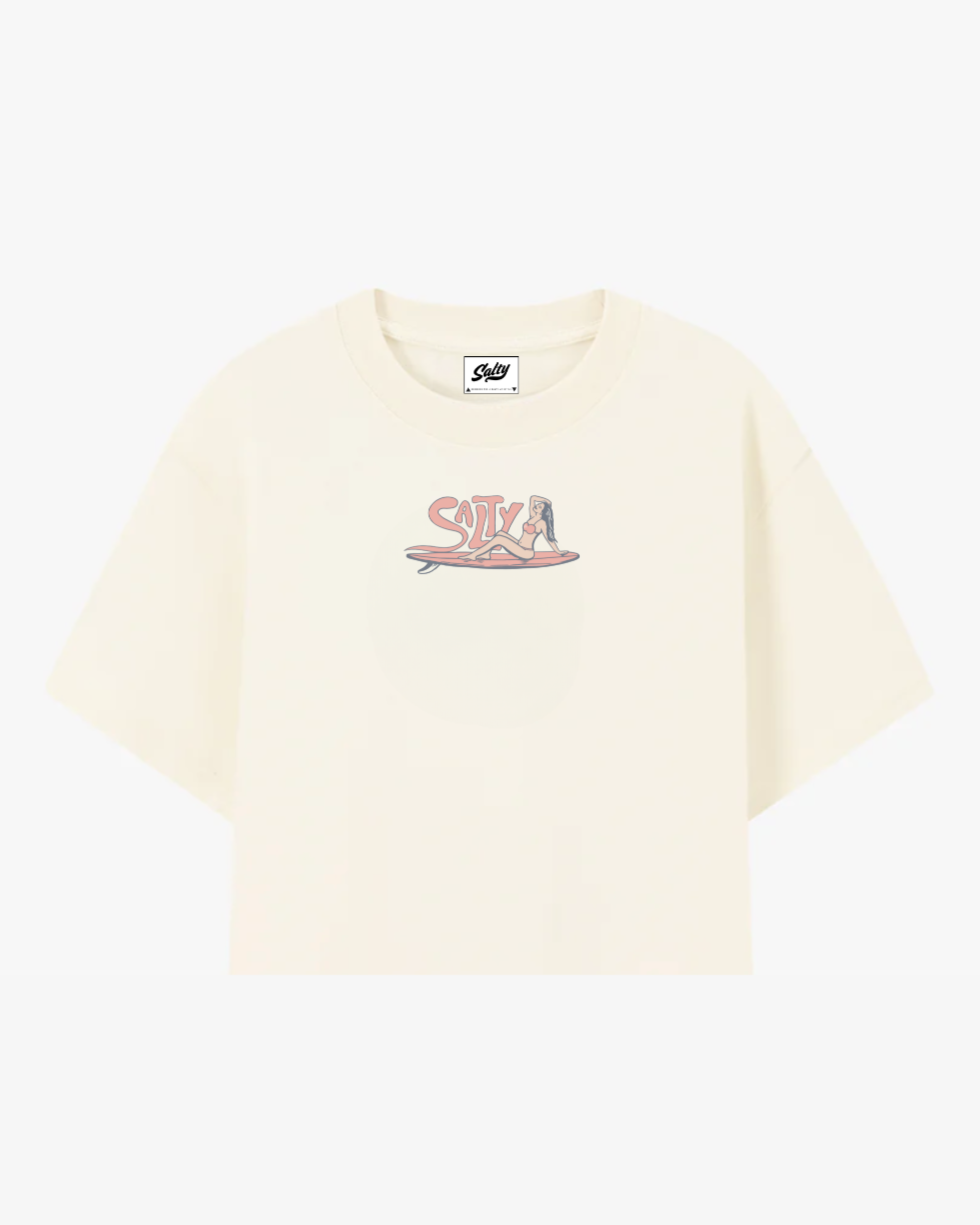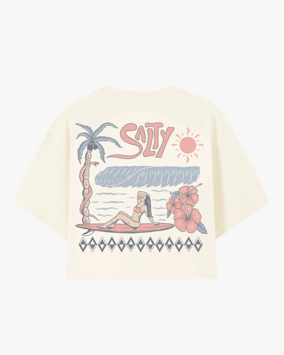 The Salty Surfer Girl Tee. Crafted from 100% premium cotton, this white short sleeve shirt delivers a breezy, boxy fit with a soft feel and breathable weight.